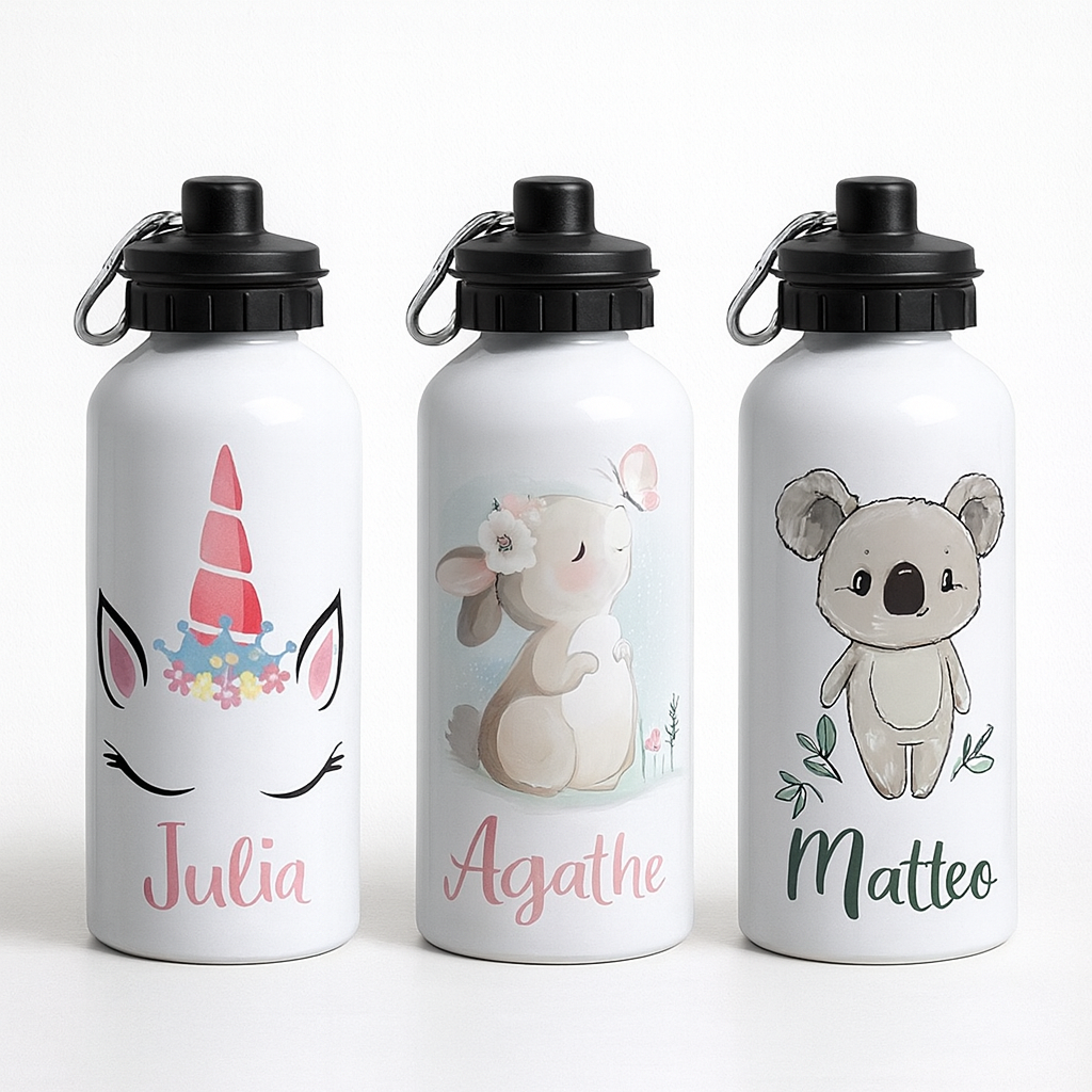Le design de la gourde est totalement libre : dessin, prénom, photo... à vous de voir ! Indiquez moi un thème, comme licorne par exemple, et je vous enverrai des propositions d'images par e-mail.