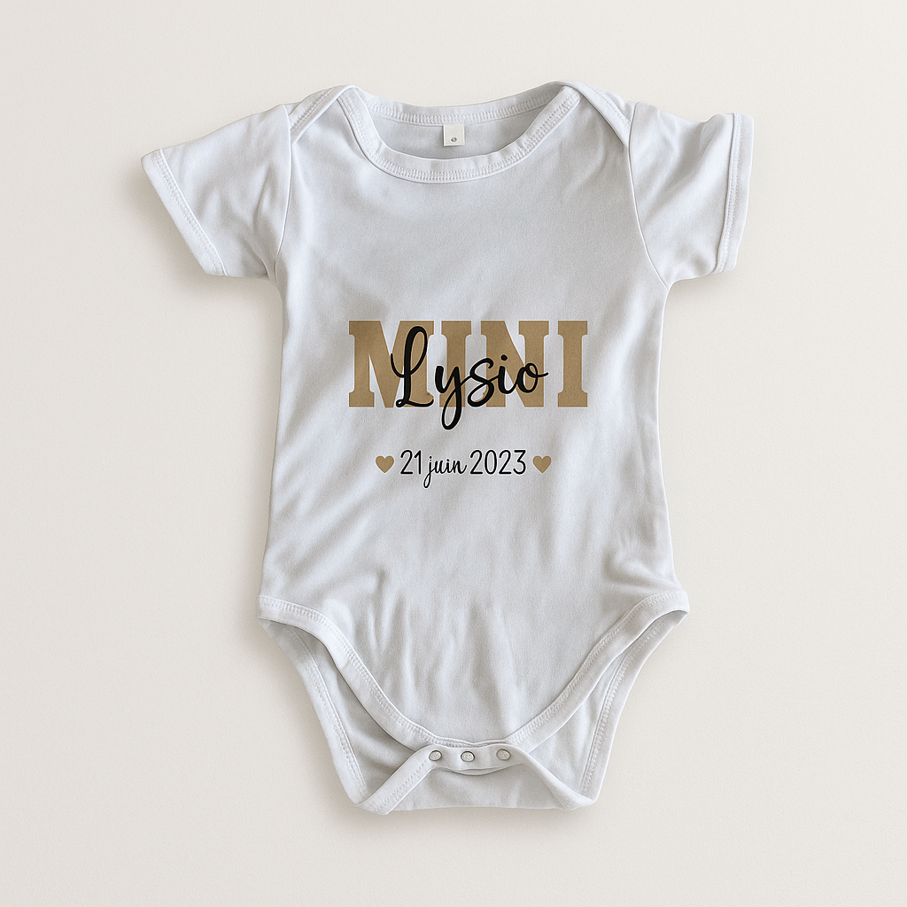 Technique d'impression : Sublimation. La personnalisation est donc ancrée dans le body, pour une plus longues tenue dans le temps et un meilleur confort pour bébé.
