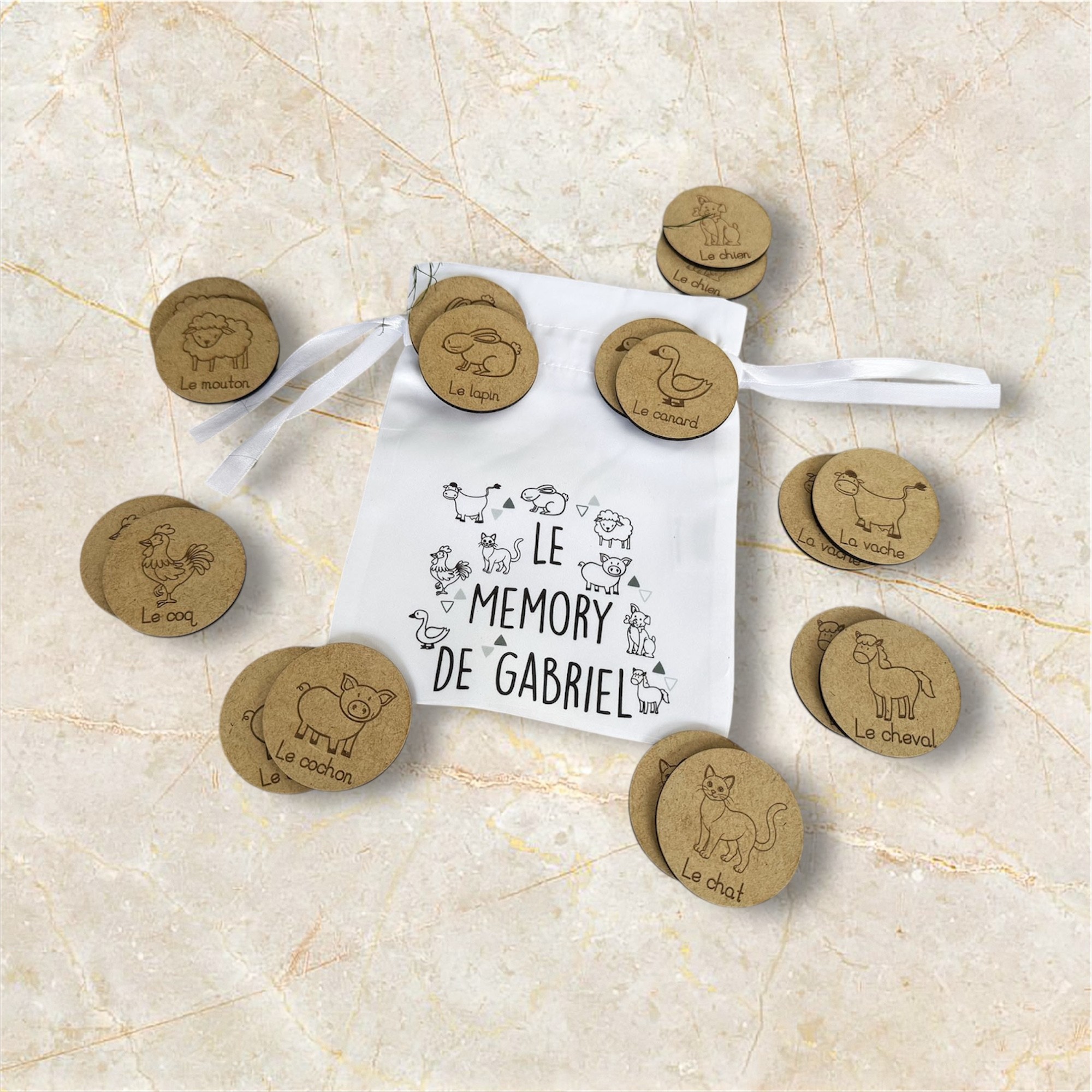 - En option, le memory est vendu dans une pochon personnalisé avec les même dessins que ceux que vous retrouverez sur le jeu de meory ;
