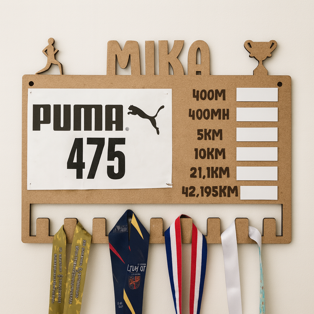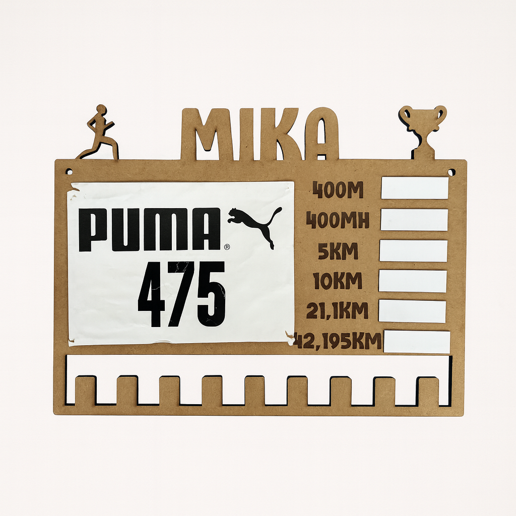 - A gauche du tableau, un systéme magnétique (un magnet collé au bois + un magnet a fixer sur le dossard) pour conserver votre dossard préféré ;