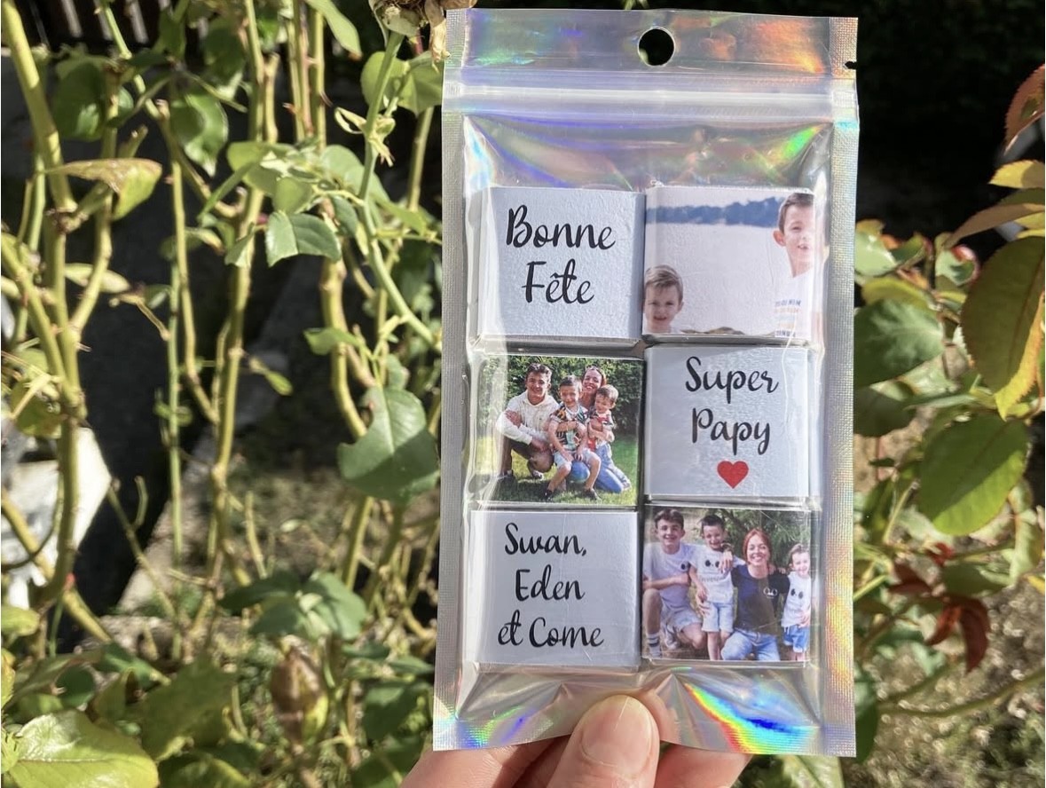 Particularité : Ce coffret comprend 6 chocolats au lait personnalisés. Ils sont vendus dans une pochette refermable de présentation en plastique et aluminium durable.