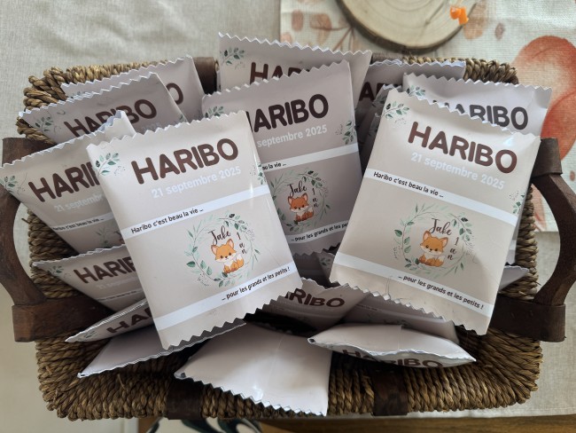 Personnalisation : La personnalisation est imprimée sur du papier photo puis collée au dessus de l'emballage d'originie. La nourriture n'est donc pas directement manipulée.