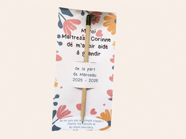 Gravé du mot “Merci” ou d'un coeur (au choix) sur une face et d’un smiley sur l’autre, ce haricot magique révèle son message en grandissant. Il suffit de le planter, de l’arroser… et de laisser la magie opérer : le mot “Merci” ou le coeur apparaîtra sur ses feuilles !