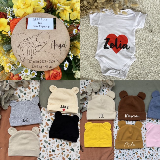 Personnalisation de l'article : le prénom, la date de naissance, les informations de naissance (poids, taille et heure).