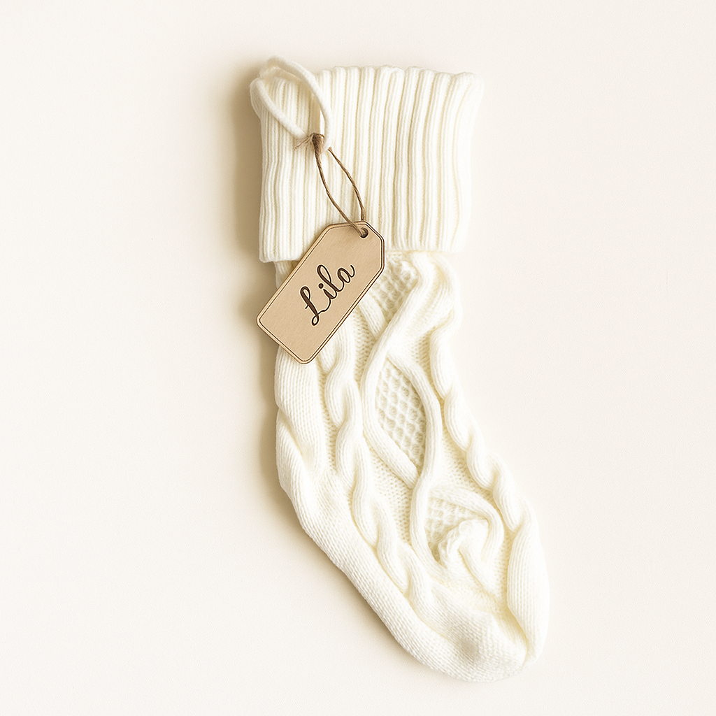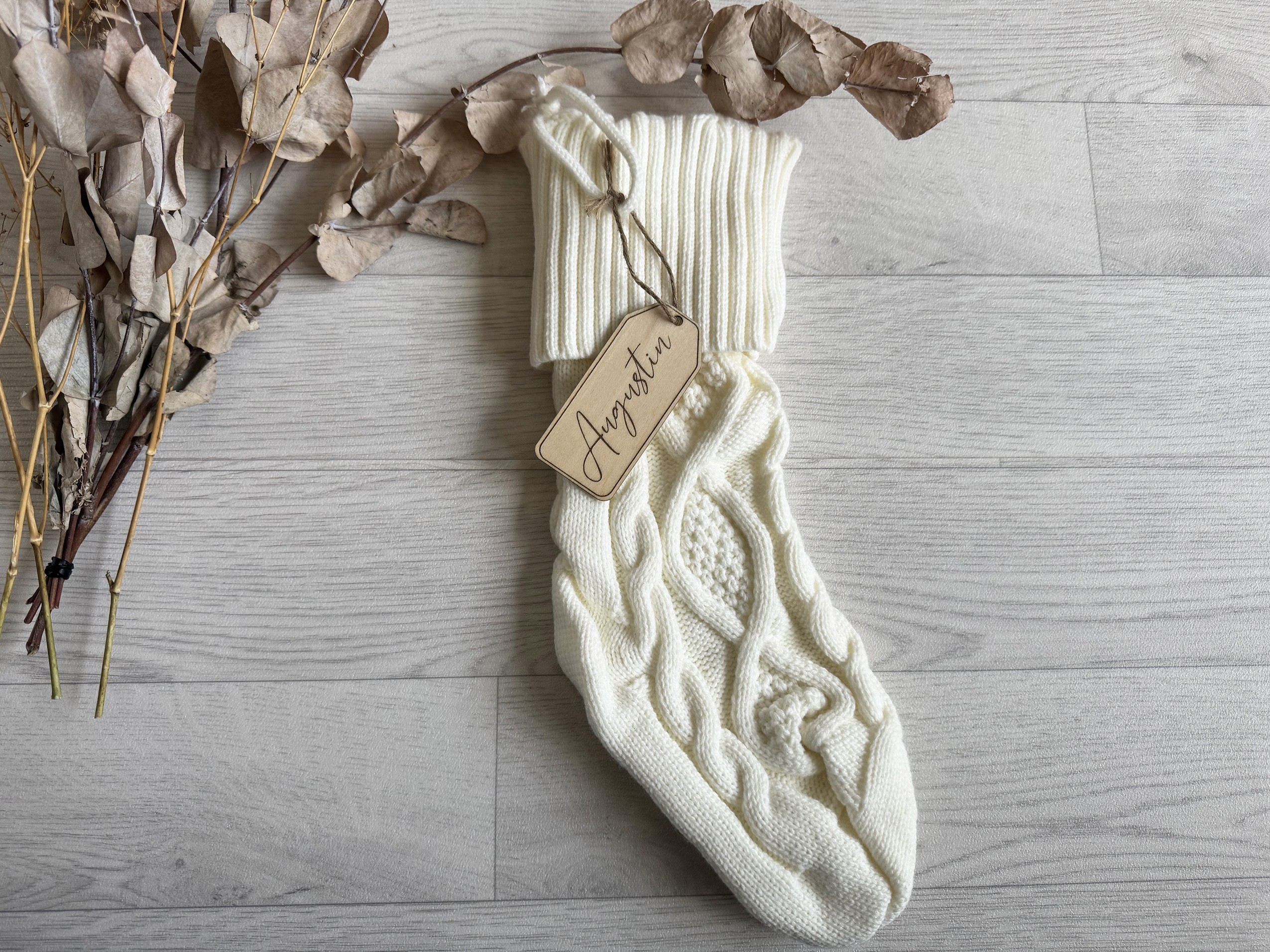 - Le prénom est découpé dans du bois de 6 mm et accroché à la chaussette