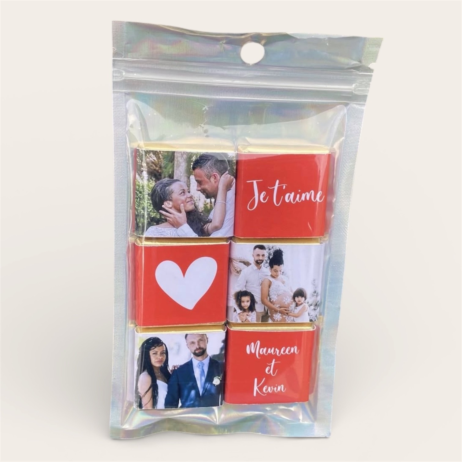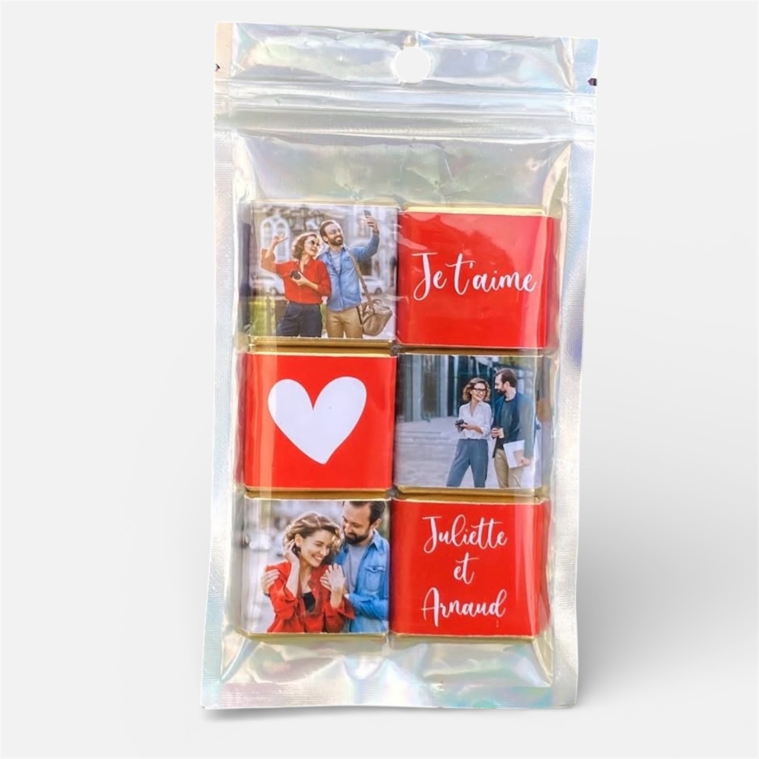 Ce coffret comprend 6 chocolats au lait personnalisés. Ils sont vendus dans une pochette refermable de présentation en plastique et aluminium durable.