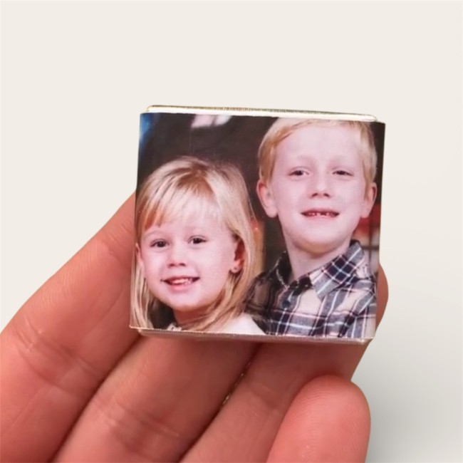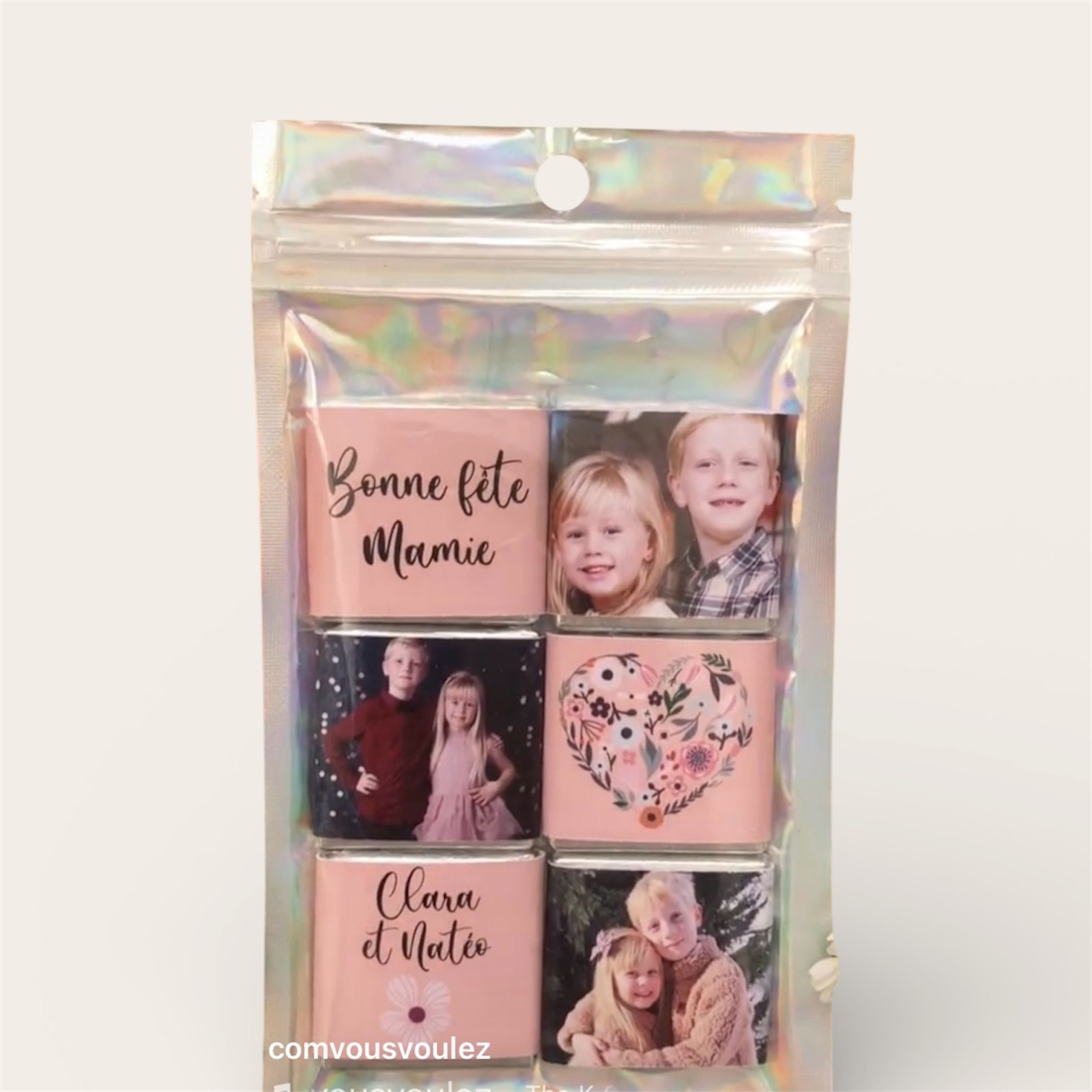 Ce coffret comprend 6 chocolats au lait personnalisés. Ils sont vendus dans une pochette refermable de présentation en plastique et aluminium durable.